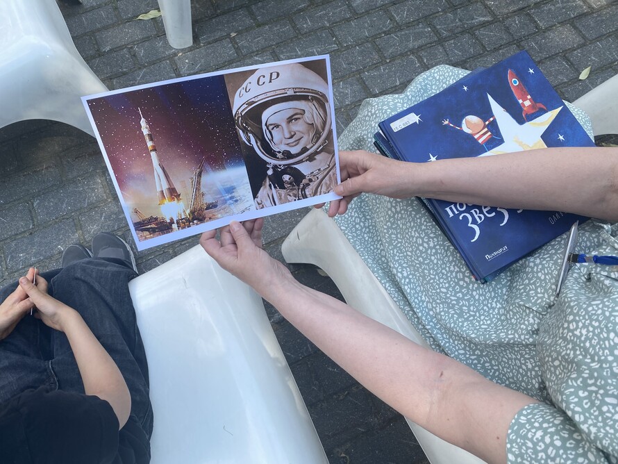 В июне мы успели познакомиться с творчеством британского автора и иллюстратора Джудит Керр, сделали настоящую «тигроробику» и собственные маски тигра. А в следующий раз почитали о космосе и сделали креативные фотографии с ракетой, вспомнив первый полет женщины-космонавта Валентины Терешковой.