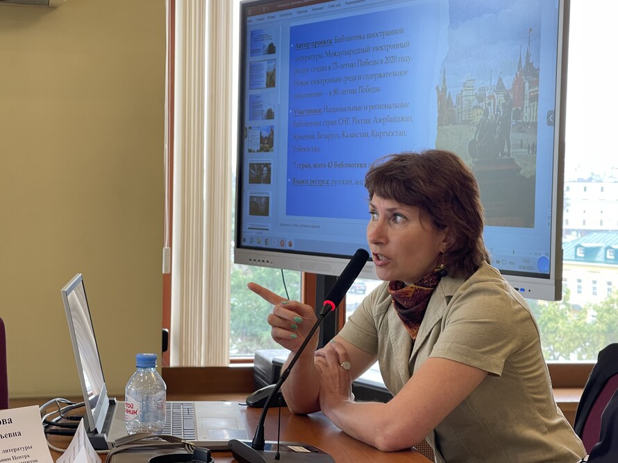 Руководитель Центра библиотековедения и профессионального взаимодействия Дарья Белякова представила международный электронный ресурс «Библиотеки — свидетели Победы: молодые — о молодых — для молодых», который был основан в 2020 году к 75-летию Победы на материалах Национальных библиотек и архивов стран СНГ и ШОС. К 80-летию Победы ресурс был обновлен: появилась новая электронная среда и дополнено содержание. Руководитель Центра междисциплинарных исследований Владимир Фролов рассказал в своём выступлении о мультимедийной выставке «Сопротивление Европы» и акцентировал внимание на необходимости объединения усилий библиотек и архивов с целью дальнейшего раскрытия документов об антифашистском европейском сопротивлении. Ведущий библиотекарь Центра междисциплинарных исследований Людмила Феноменова представила новое издание Библиотеки иностранной литературы «Писатели-фронтовики», подготовленное сотрудниками Центра. Главный эксперт ПАО «Россети Московский Регион» Елизавета Семичева рассказала о совместном проекте с Центром культурно-просветительских программ «Иностранки» — театральной зарисовке «Книга и подвиг», которая проходила в рамках ежегодной акции «Библионочь». Основой постановки стали мемуары М. И. Рудомино, произведения антифашистских иностранных авторов, архивные документы Библиотеки.