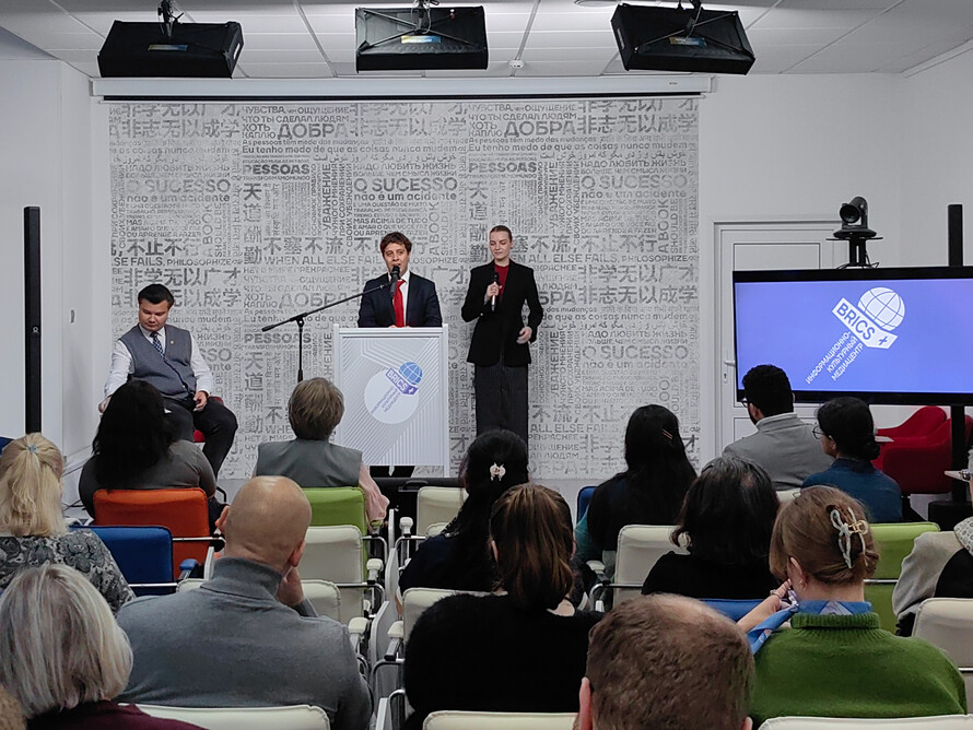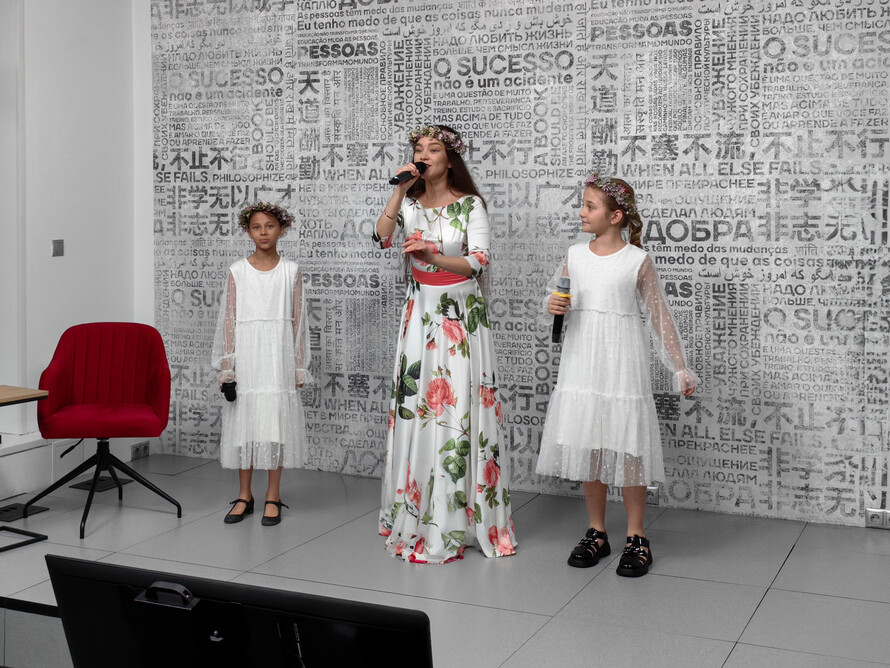 После поздравительных речей пространство Медиацентра БРИКС+ наполнилось музыкой. Юные учащиеся кафедры искусств Школы «Интеграция XXI век» Ева Володина и Екатерина Львовская, а также их педагог Юлия Нагаева исполнили композицию «Матушка» Татьяны Куртуковой, дополнив её стилизованным народным танцем.