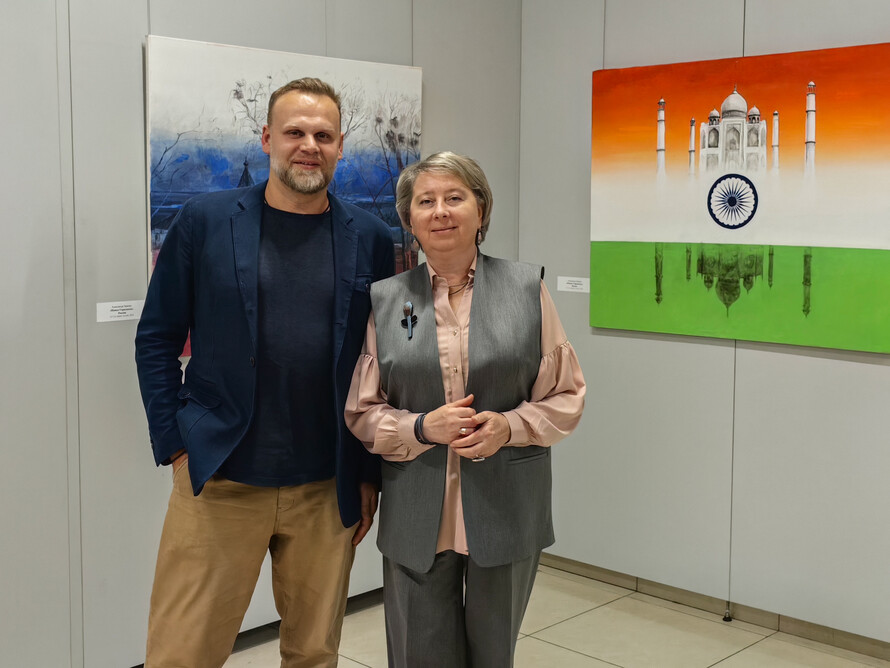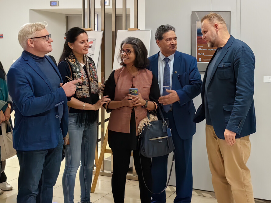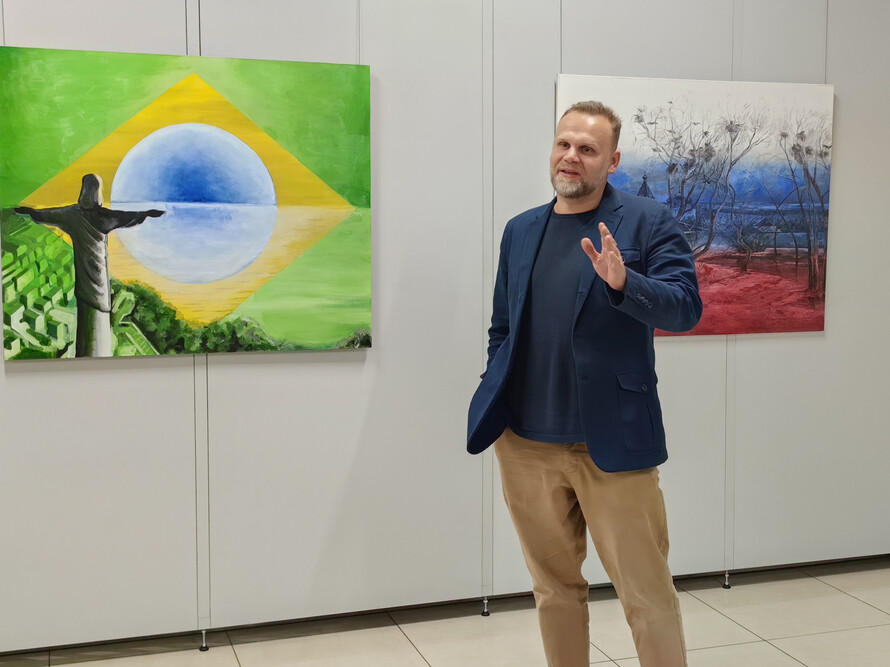 Завершился вечер открытием выставки «Новые горизонты» и кураторской экскурсией от художника Александра Заикина. Центром композиции его картин, написанных акрилом, являются флаги государств-основателей БРИКС (Бразилия, Россия, Индия, Китай, Южная Африка). Они отражают национальную идентичность, природный и культурный ландшафт стран объединения. Художник рассказал о своих полотнах и предназначении творчества в постоянно меняющемся мире. В экспозиции представлены и работы учеников мастера из Школы «Интеграция XXI век», которые демонстрируют детский взгляд на мир БРИКС.