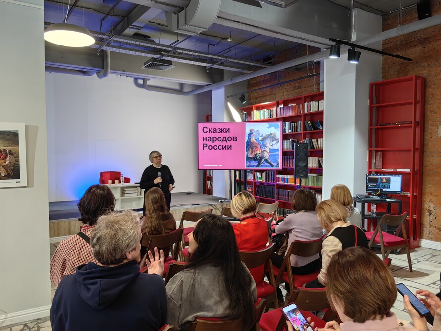С 18:30 в Книжном клубе «Иностранки» стартовали чтения на «Территории сказок»! У импровизированного очага звучали сказки народов России в исполнении профессиональных чтецов: ассоциированного члена клуба ЮНЕСКО «Клуб друзей Алтая имени В. И. Чаптынова» Валентины Паянтиновой, студентов 1-го курса удмуртской студии ВТУ (института) им. М. С. Щепкина, Литературного института имени А. М. Горького и других. Рядом проходил мастер‑класс по созданию коллажей на основе фольклорных мотивов, а на стенах работала выставка видео‑арта — современное цифровое прочтение традиционных сюжетов. И здесь же развернулась передвижная фотовыставка «Сила традиций: народы Российской Федерации», где гости узнавали о фестивалях, обрядах и национальных костюмах разных регионов.