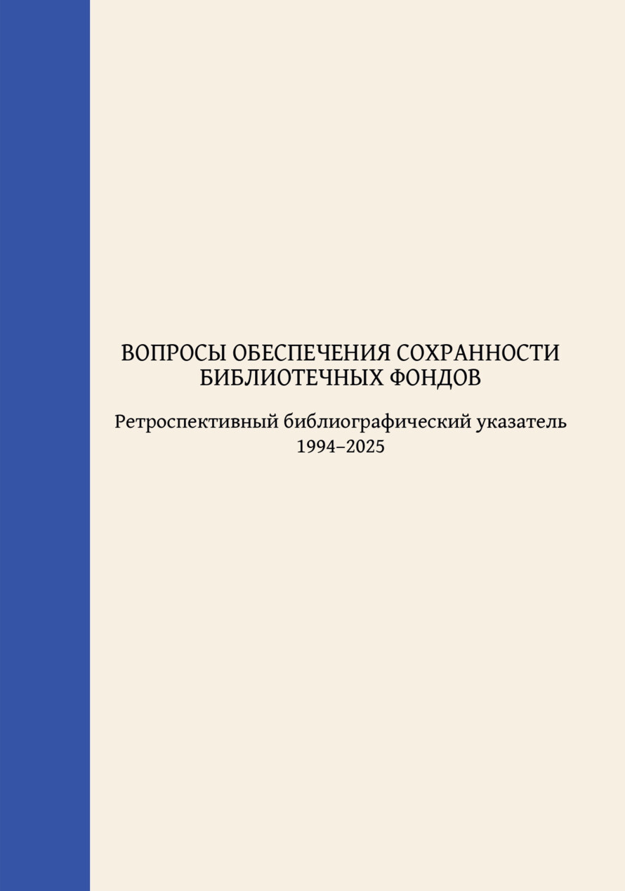 Вопросы обеспечения сохранности библиотечных фондов: ретроспективный библиографический указатель: [1994–2025 гг.] / Библиотека иностранной литературы; составители В. Д. Евплов, Е. Д. Попцова, Р. М. Сальникова. — Москва: Библиотека иностранной литературы, 2025. — 138 с. — ISBN 978-5-6053865-8-2.