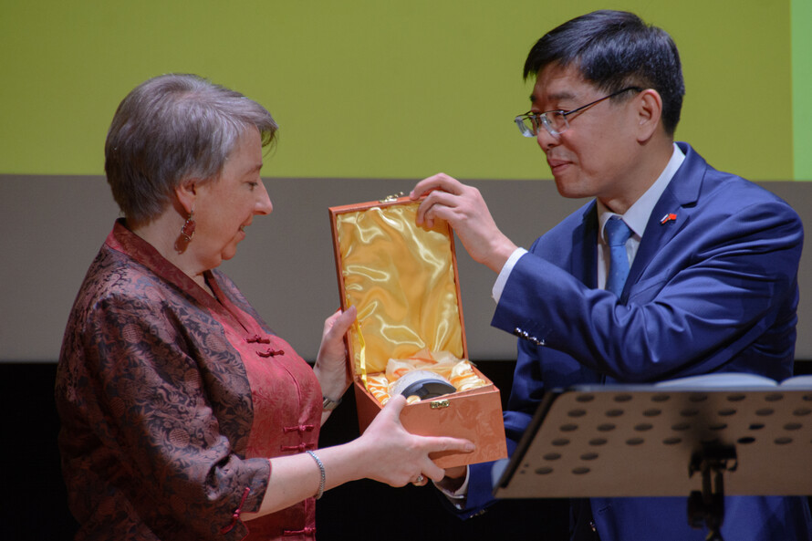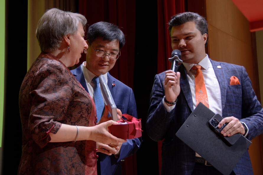 Марина Павловна Захаренко вручила господину Фэну Литао памятный значок «Иностранки», книгу о Маргарите Ивановне Рудомино, вышедшую в знаковой серии «Жизнь замечательных людей» издательства «Молодая гвардия», и авторскую фигурку в форме лошади — символа приближающегося 2026 года.