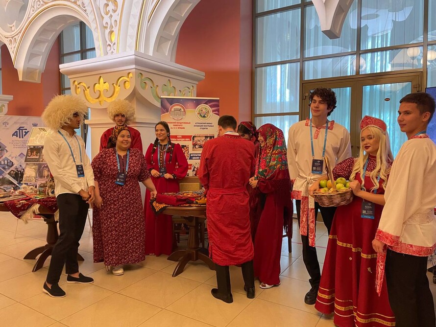 В холле Астраханского государственного театра оперы и балета участников и гостей встречали иностранные студенты астраханских вузов в национальных костюмах.