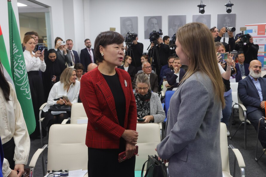 Советник-посланник Посольства Китайской Народной Республики в Москве госпожа Лю Цинхуа поздравила Библиотеку иностранной литературы и международную медиасеть TV BRICS с открытием Центра.
