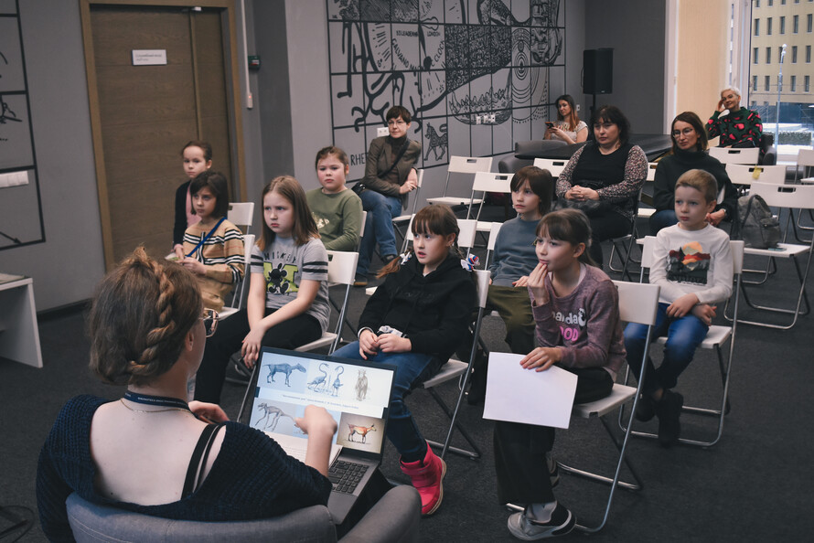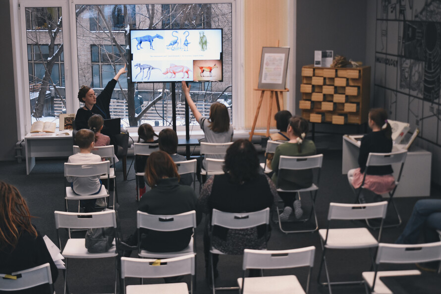 Мастер-класс «Работа над ошибками палеонтолога» провела сотрудница Центра детской книги «Иностранки» Анастасия Огородникова. Юные посетители прикоснулись к истории развития палеонтологии и узнали, почему за сто пятьдесят лет со времени открытия тираннозавров представления о том, как они выглядели, менялись три-четыре раза. Палеонтологи прошлого считали, что знаменитый тирекс волочёт свой хвост по земле, а, например, у предка носорога отсутствует рог (спойлер — рог не сохраняется. Он из того же «материала», что и ногти, и волосы).